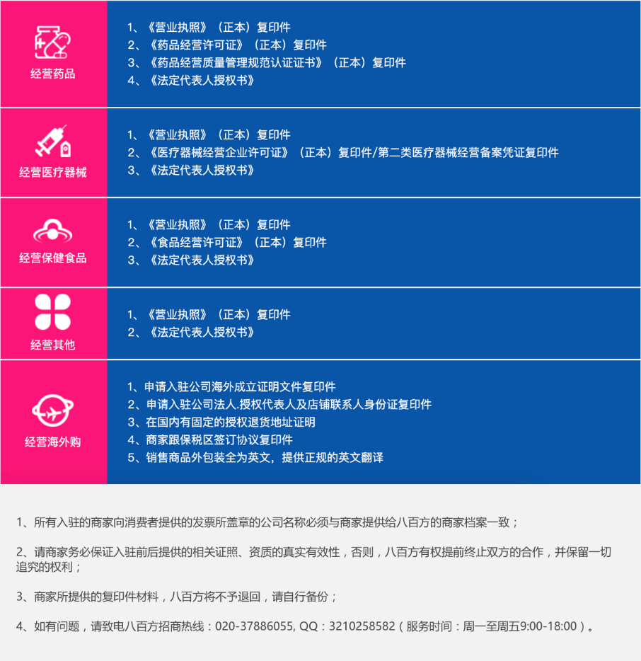 A:八百方只接受取得工商部門合法登記注冊的《營業執照》的商家,且商家應確保有與經營項目對應的政府部門認證和經營的資質。